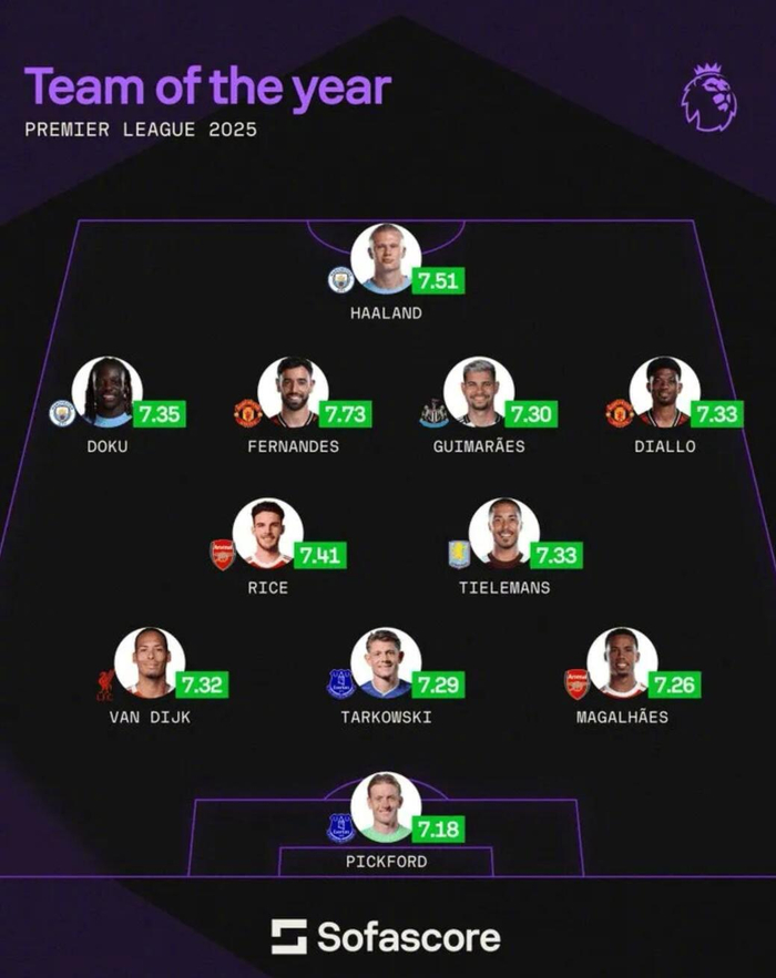 数据网站Sofascore今日公布了2025年英超年度最佳阵容,基于球员全年联赛表现评分,评选出赛季最具代表性的11人阵容。