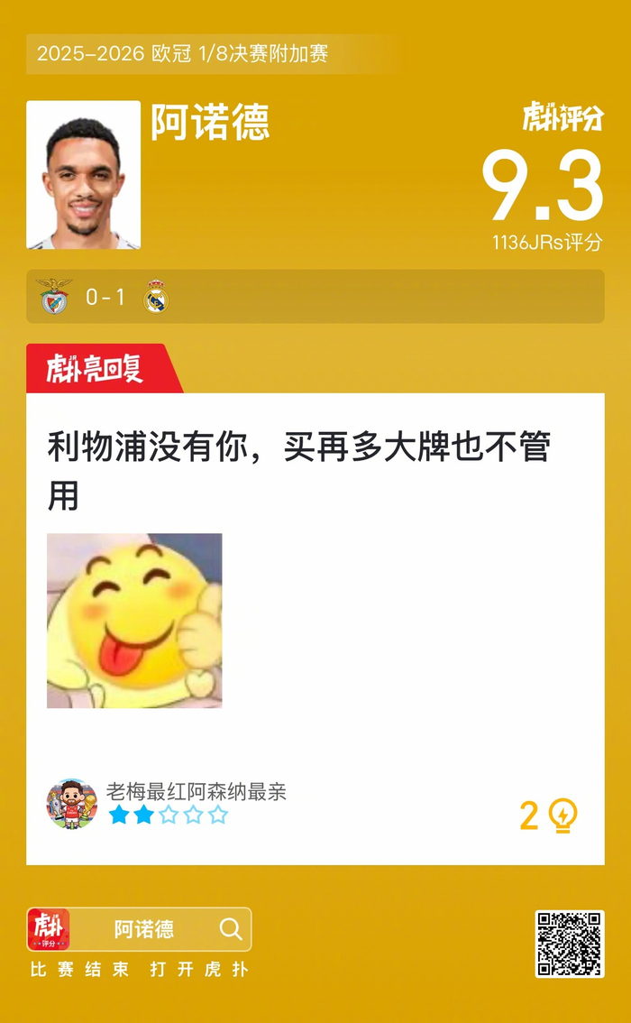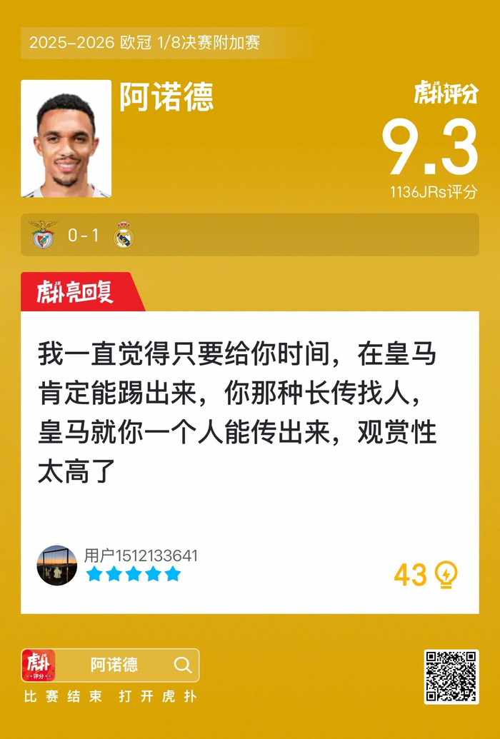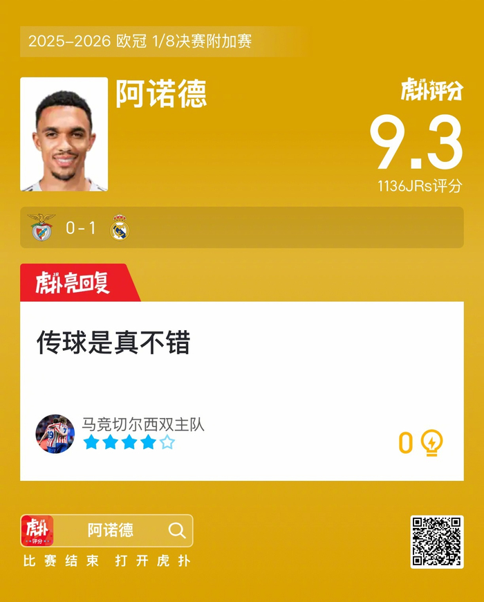 #本菲卡0比1皇马#阿诺德赛后收获9.3的虎扑评分!