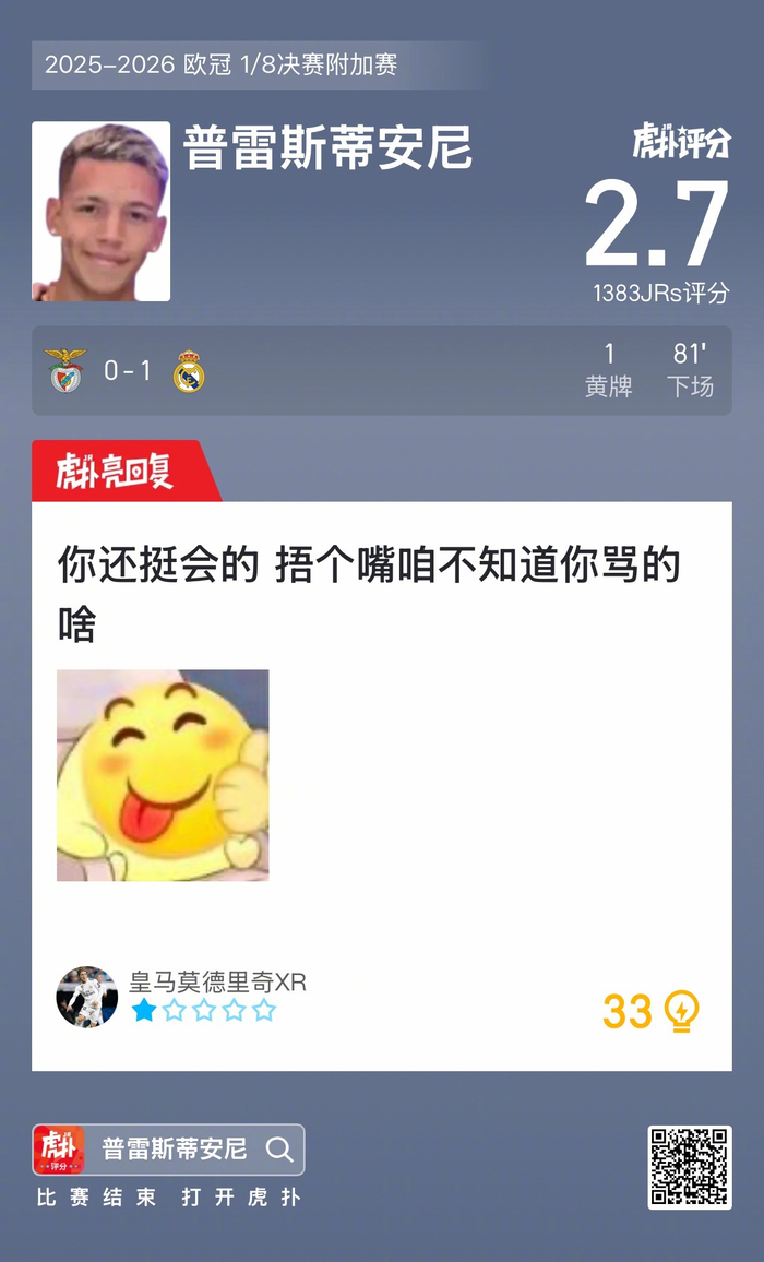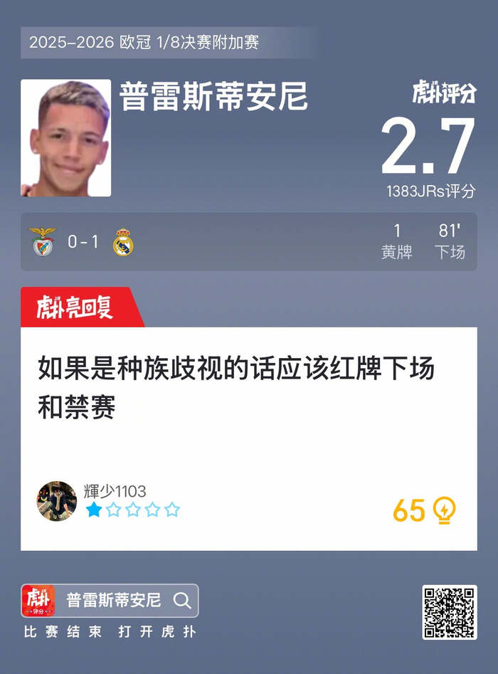 #本菲卡0比1皇马#本菲卡球员普雷斯蒂安尼吃到一张黄牌,赛后收获2.7的虎扑评分!