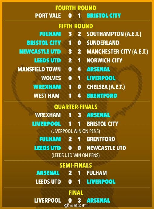 1/4决赛,阿森纳3-1淘汰雷克瑟姆,利物浦则通过点球大战击败布里斯托城,富勒姆2-1布伦特福德,利兹联则依靠点球大战淘汰纽卡晋级四强。
