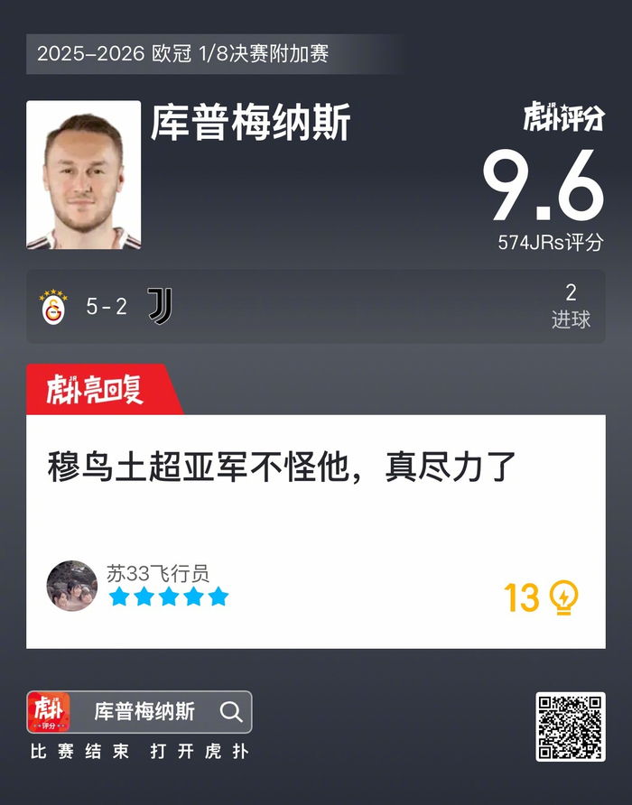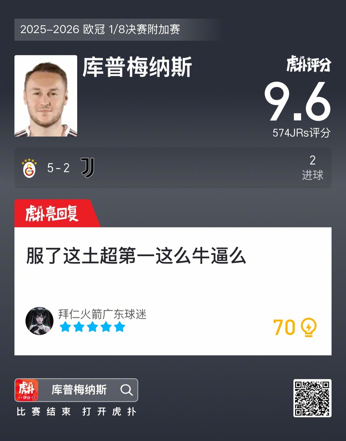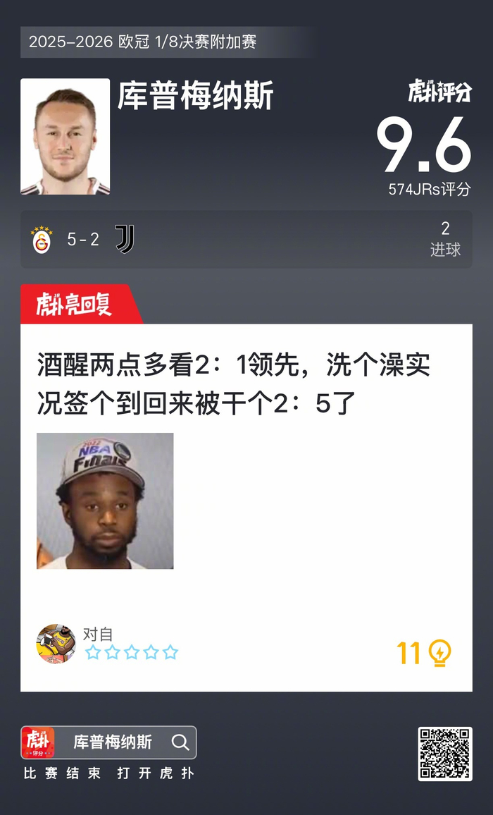 #加拉塔萨雷5比2尤文图斯#库普梅纳斯打进两球,这表现给几分?