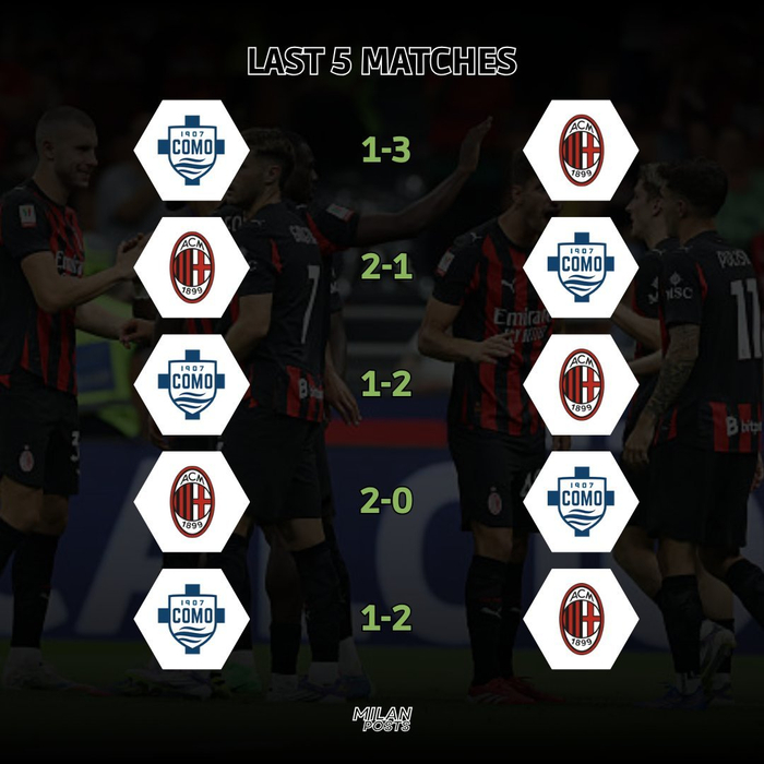 【对阵数据📊】🔴⚫️ 米兰与本轮#意甲联赛# 对手科莫队最近5场交锋记录:米兰5战5胜。#sempremilan#