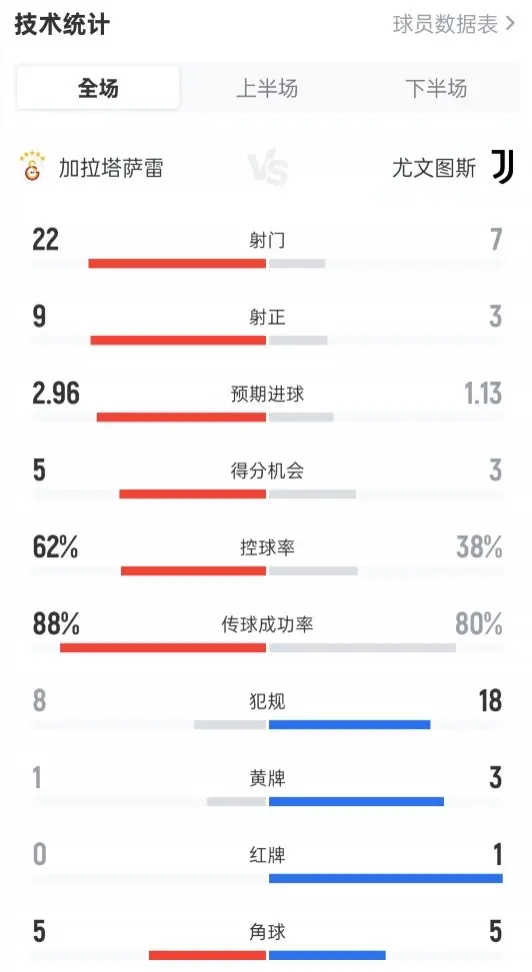看看这组数据:全场射门22-7,射正9-3,控球率38%。加拉塔萨雷像在训练赛一样肆意穿插尤文的腹地。桑切斯、奥斯梅恩、诺阿·朗,甚至是被尤文旧将“羞辱”的萨拉,每个人都在尤文的禁区内跳舞。