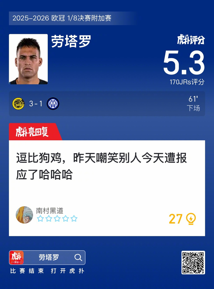 #博德闪耀3比1国际米兰#劳塔罗赛后收获5.3的虎扑评分!