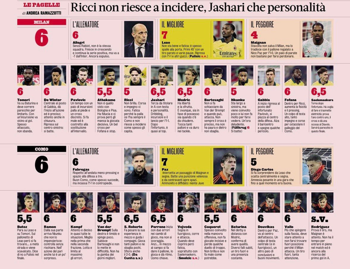 【米体】 #AC米兰1比1科莫# 赛后评分: