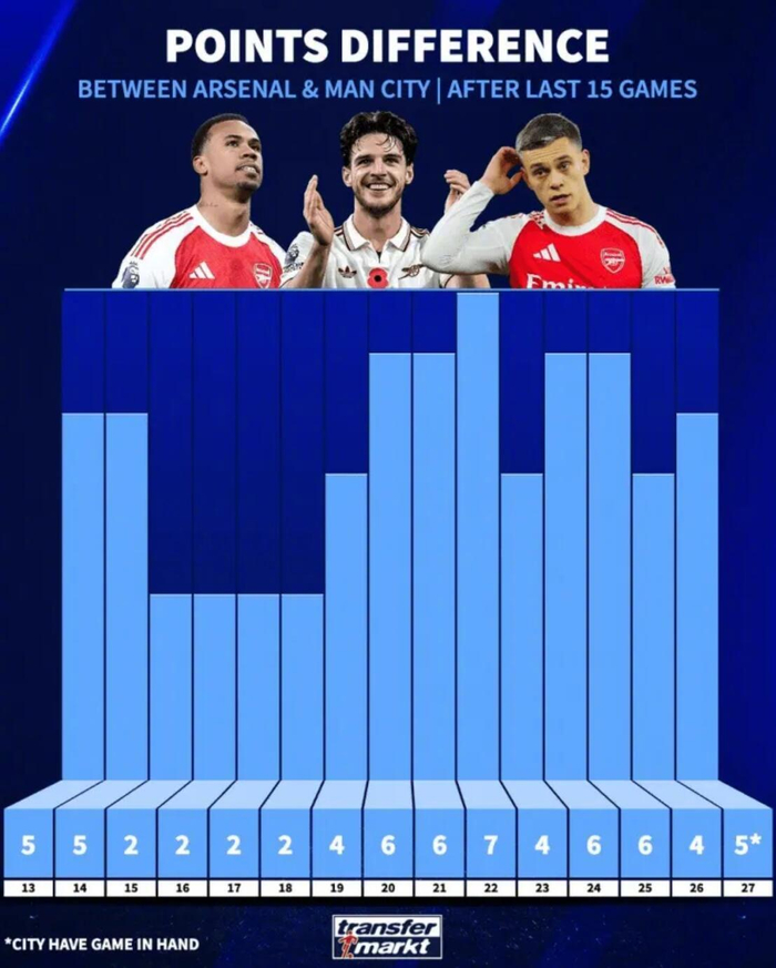 德国转会市场盘点了阿森纳和曼城在最近15场英超联赛的分差,目前阿森纳多赛一场领先5分。