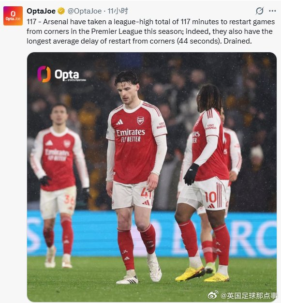OPTA:阿森纳本赛季角球开出后重新开始比赛的总耗时高达117分钟,位列英超联赛第一;角球后重新开球的平均延迟时间为 44 秒,也是英超联赛所有球队中最长的。