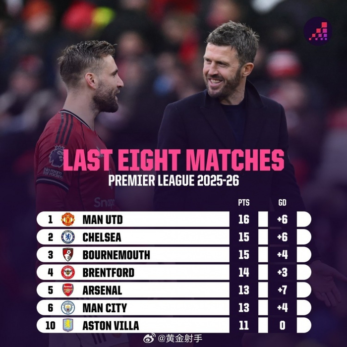 #曼城[超话]# Opta统计了各队近8场英超比赛拿到的积分,并列出榜单,曼联16分最多,切尔西、伯恩茅斯15分次席。