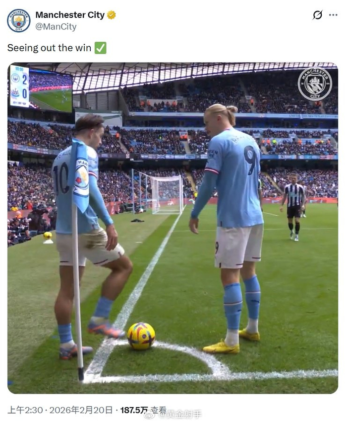 #曼城[超话]# 曼城将在本轮英超迎战纽卡,赛前曼城官方社媒分享了一段3年前哈兰德对纽卡连续造角球拖延时间的欢乐片段。并且配文:“守住胜果”。视频中的一幕发生在2022/23赛季英超第26轮,那场比赛曼城主场2-0击败纽卡,哈兰德补时阶段和格拉利什联手在角球区连造4个角球,最后自己也忍不住笑了。北京时间2月22日凌晨4点,曼城将主场迎战纽卡。#黄金射手##超话创作官##繁花计划#