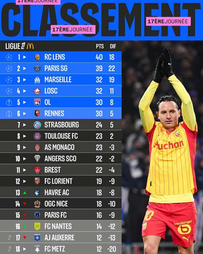 【法甲积分榜】 #法甲# 2025-26赛季法甲联赛第17轮积分榜。
