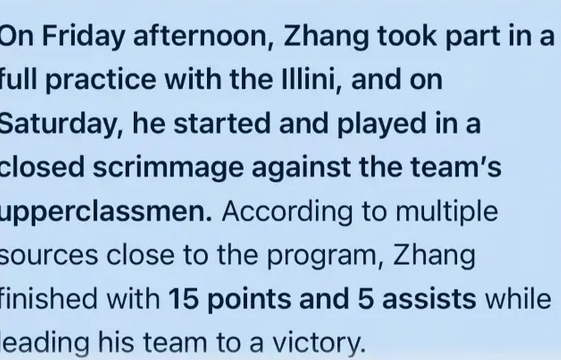 根据此前的美媒报道,张博源参加了伊利诺伊大学的全队合练;他作为首发,与校队高年级球员进行了一场封闭对抗赛。据多位接近球队的消息源透露,张博源砍下15分、送出5次助攻,并带领自己的队伍取得了胜利。