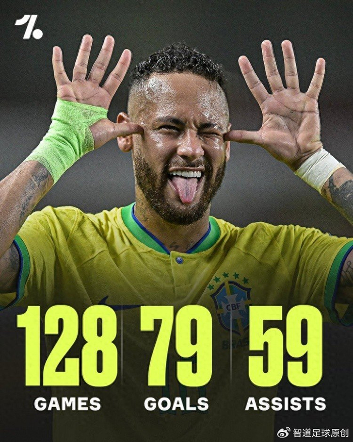 Onefootball更新社媒动态,并晒出了内马尔在巴西国家队的数据,至今各项赛事代表桑巴军团出场128次,打入了79个进球,还有59次助攻,合计参与进球138个,场均参与进球>1个,真是效率奇高。