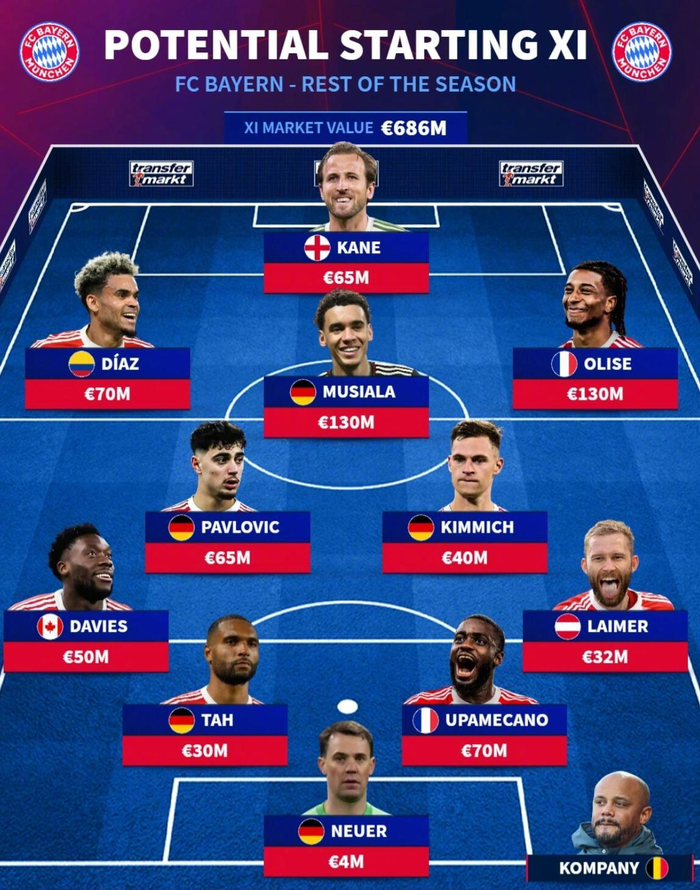 德转官方预测拜仁慕尼黑在本赛季剩余比赛中的首发阵容: