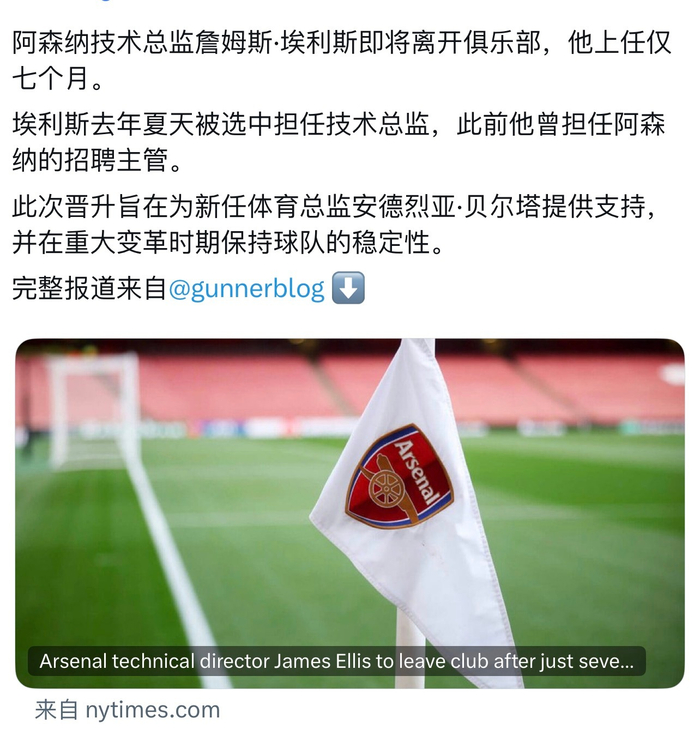 有点突然,2021年从富勒姆加入你厂的詹姆斯·埃利斯,在被提拔为技术总监仅7个月后,就要离开球队