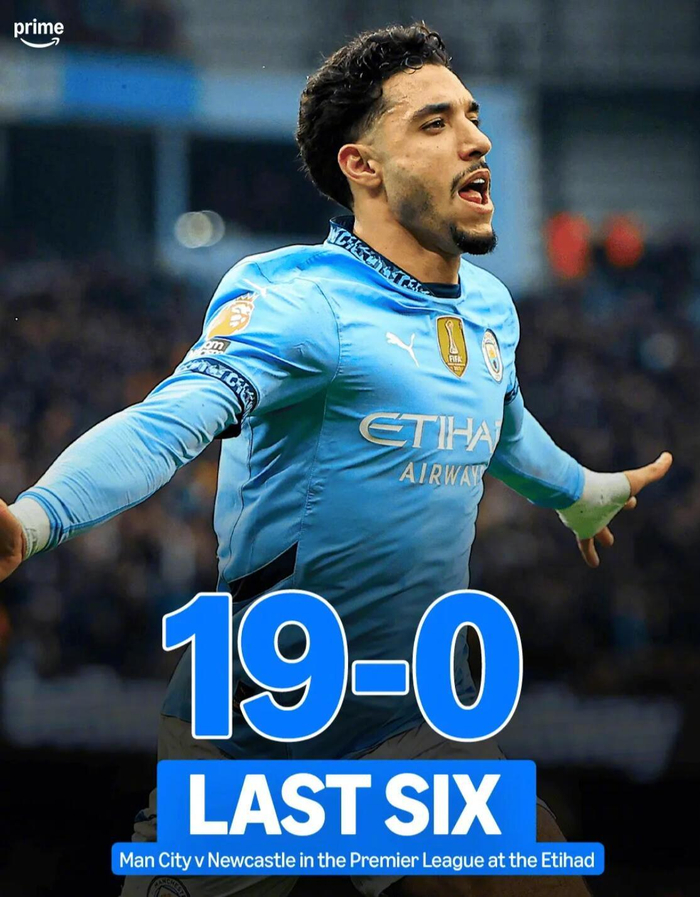 根据Amazon Prime Sport的统计,曼城在最近6次英超联赛主场对阵纽卡斯尔联的比赛里,打进19球,且没有失球。