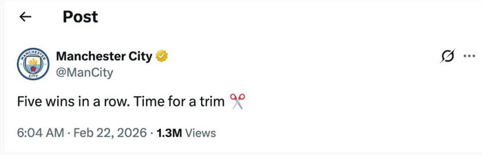 赛后曼城官方社媒玩梗,发文:“五连胜到手,是时候剪发了“。隔空调侃曼联 “蓄发哥”—— 这位球迷誓言曼联五连胜才剪发,如今曼城先达成成就,官方直接送上 “理发提醒”。