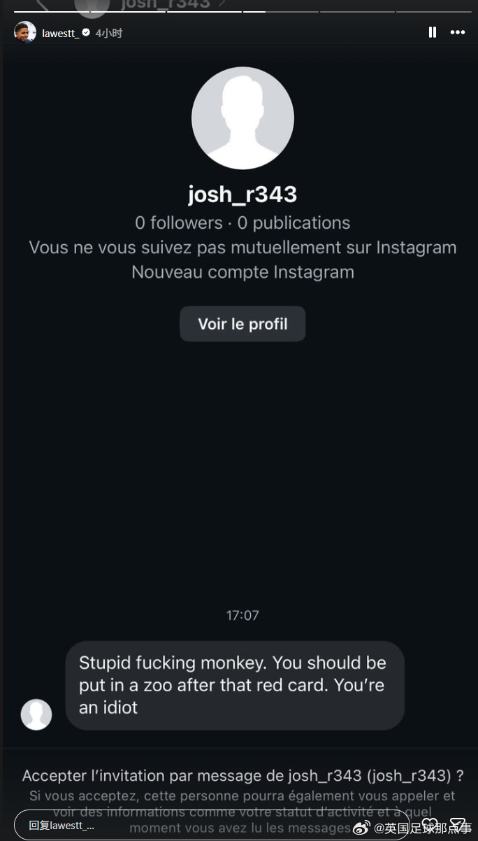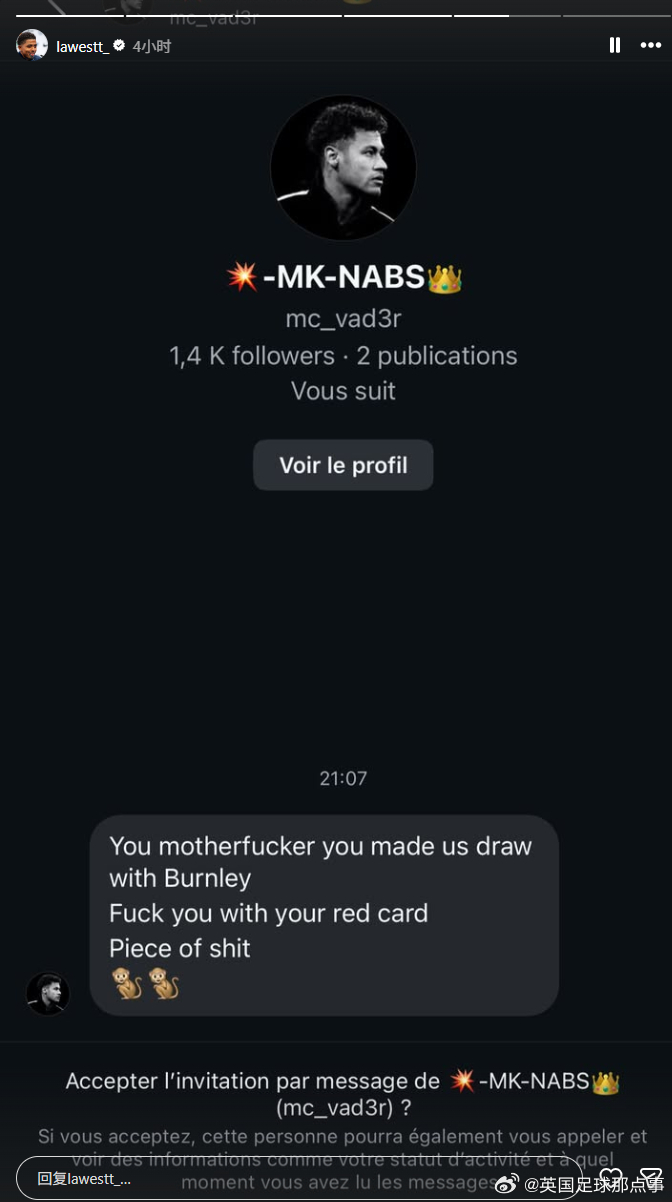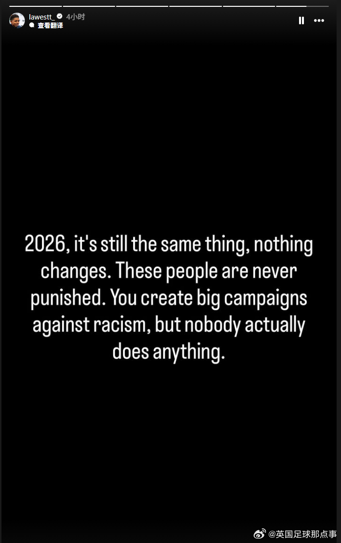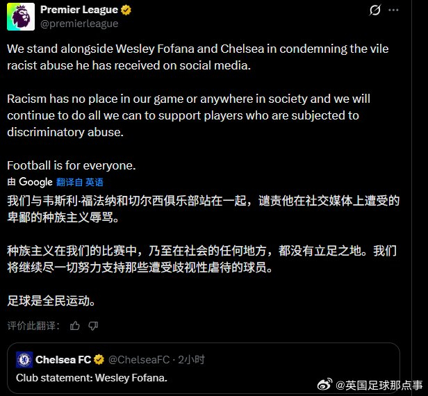切尔西后卫福法纳遭到种族歧视😱昨晚被红牌罚下后,福法纳的社媒账号收到大量辱骂,福法纳截图挂出了对他进行种族歧视的 5 位球迷(图1-5)。福法纳:“2026年,情况依然如故,没有任何改变。这些人永远不会受到惩罚。你们发起大规模的反种族主义运动,但实际上没有人采取任何行动。”英超和切尔西官方均向他表达支持(图6-7),表示与球员同在,并查明肇事者身份,采取最严厉的措施。#切尔西1比1伯恩利#的比赛第72分钟,福法纳吃到第二张黄牌被罚下(图9)。切尔西最后时刻遭绝平,福法纳也无缘下一场对阵阿森纳的比赛。