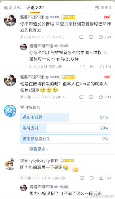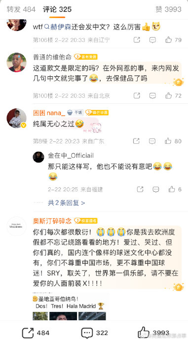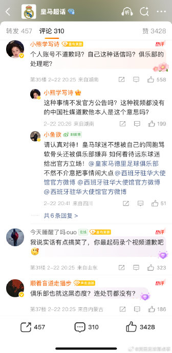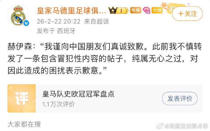 微博特供道歉皇马官方微博刚刚就赫伊森种族歧视事件发布道歉,但评论区严重翻车了……因为皇马只在微博发了,官推、官网以及当事人赫伊森的个人社媒都没有发布道歉内容