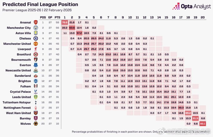 Opta在北伦敦德比前预测英超冠军概率🏆