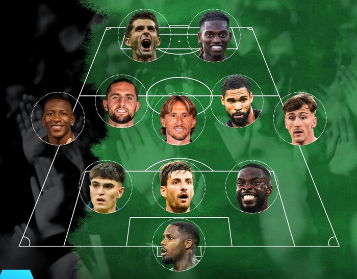 萨勒马科尔斯🇧🇪、奇克🏴、莫德里奇🇭🇷、拉比奥特🇫🇷、埃斯图皮尼安🇪🇨组成五中场;