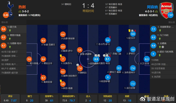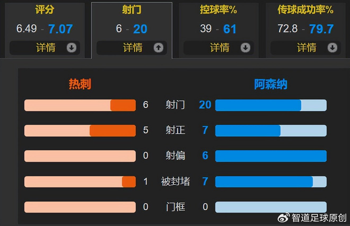 全场比赛,阿森纳的控球率为61%,一共有20次射门,其中7次射正;热刺一共有6次射门,其中5次射正。