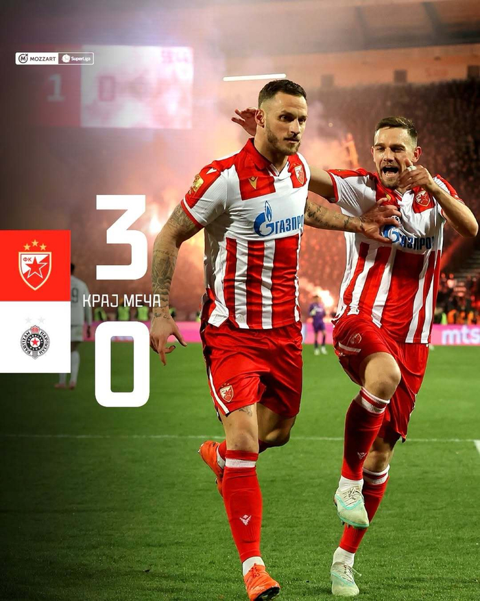 【⚔️】 #塞尔维亚超级联赛# 贝尔格莱德红星主场3:0击败贝尔格莱德游击队,克鲁尼奇🇧🇦首发打满全场。👍🏻