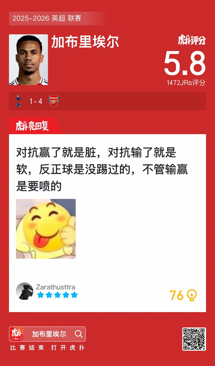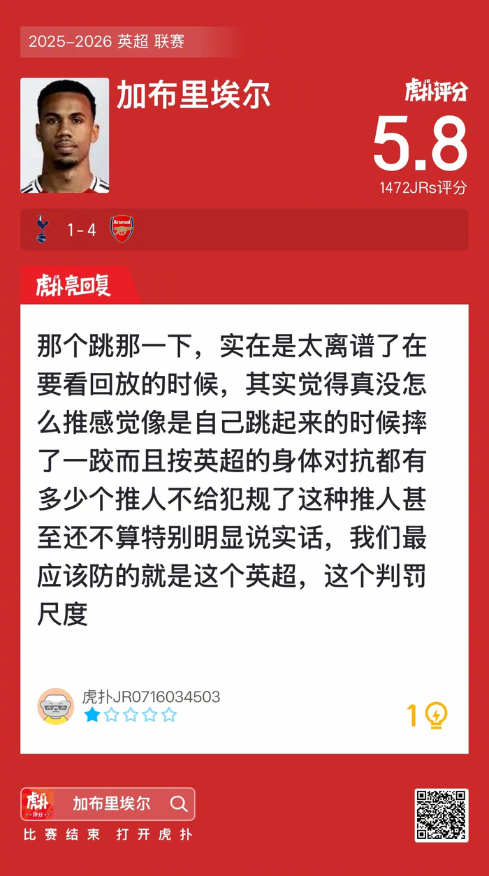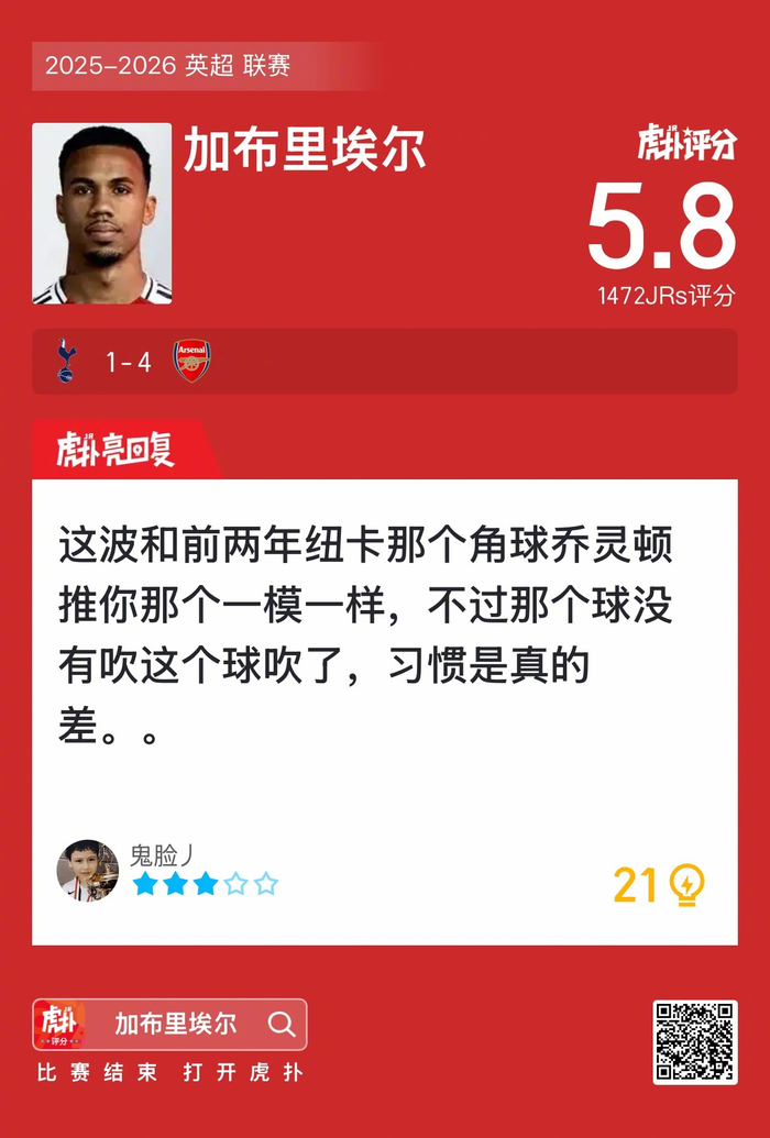 #热刺1比4阿森纳#加布里埃尔这场比赛发挥如何?
