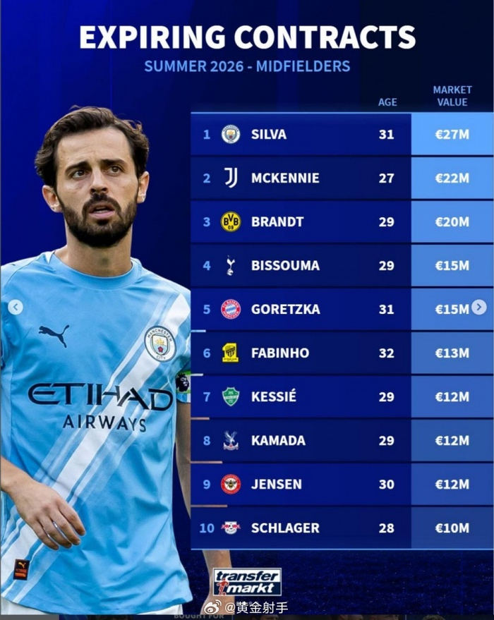 #曼城[超话]# 德转列今夏合同到期十大中场球员身价,B席2700万欧居首。