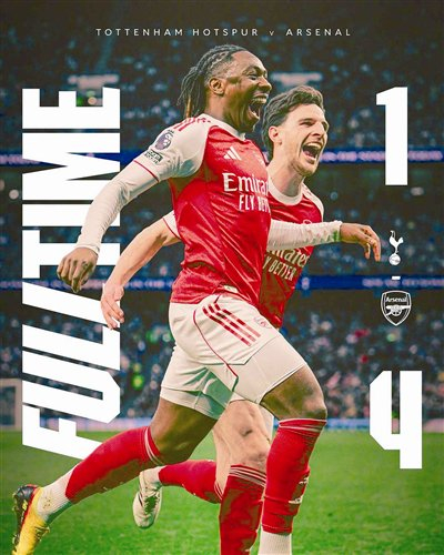 本报讯(记者 王梓)近期遭遇两轮不胜的阿森纳队,在本轮英超联赛中迎来“北伦敦德比”。最终,阿森纳队在客场以4比1大胜“死对头”热刺队,在多赛一场的情况下,以5分优势领跑积分榜。