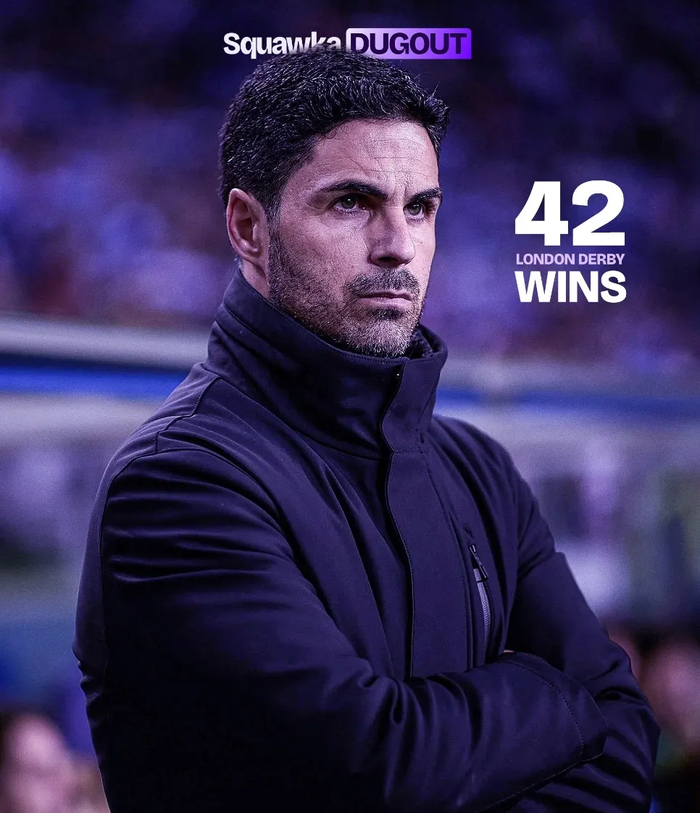 Squawka统计,在执教参加20场以上伦敦德比的教练中,阿尔特塔是胜率最高的:60.8%。