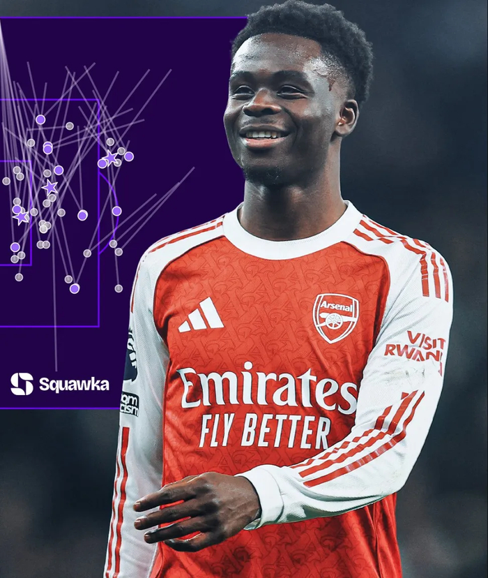 本场比赛萨卡的数据:22次遭遇地面一对一全场最多,21次传球到进攻三区全场最多,对方禁区内18次触球全场最多,4次造犯规全场最多,2次完成带球过人全场最多,2脚射正全场并列最多,1个助攻。