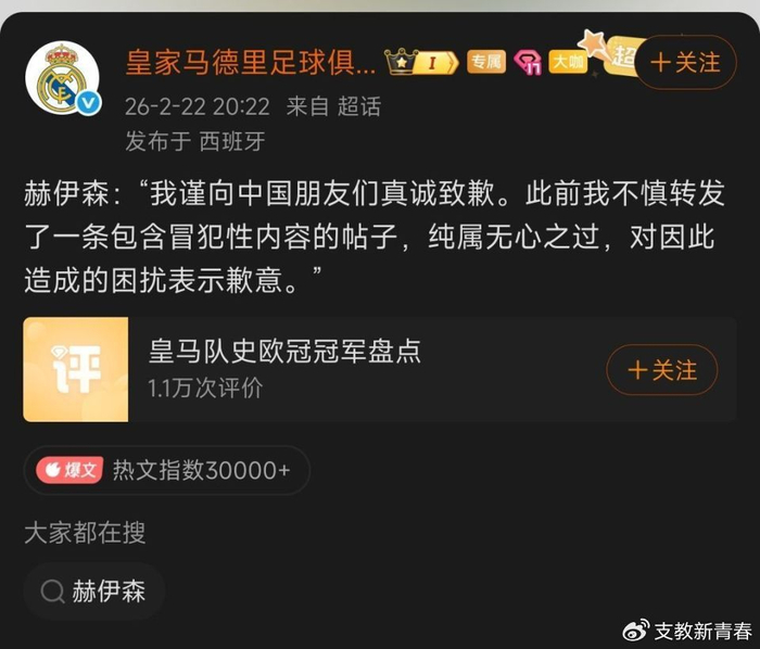 “道歉”仅仅表示赫伊森"不慎转发""无心之过",皇马官网、国际社媒账号及赫伊森个人账号没有同步内容。