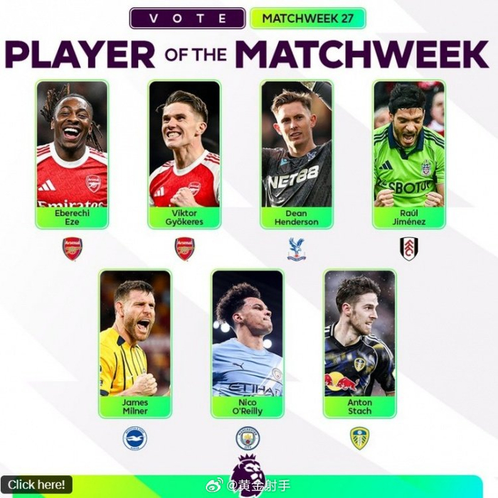#曼城[超话]# 英超官方公布了本轮最佳球员候选名单,其中阿森纳两将埃泽、约克雷斯在列,具体如下: