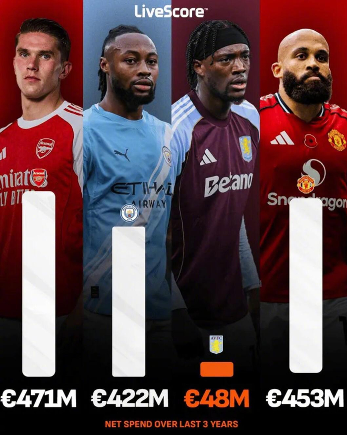 根据LiveScore的统计,尽管近年来阿斯顿维拉的净投入远低于竞争对手,但他们仍然稳居前四。