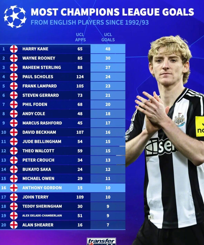 凯恩65场欧冠打进48球居首;鲁尼和斯特林分别打进30和27球排名二三;戈登已经打进10球暂排第16位。