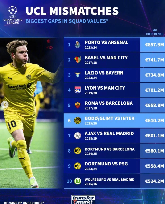 本赛季博德闪耀的身价比国米少6.102亿欧,却战胜对手晋级,排名榜单第六位。排名榜首的是波尔图在23/24赛季战胜阿森纳的比赛,两队身价差达8.579亿欧。