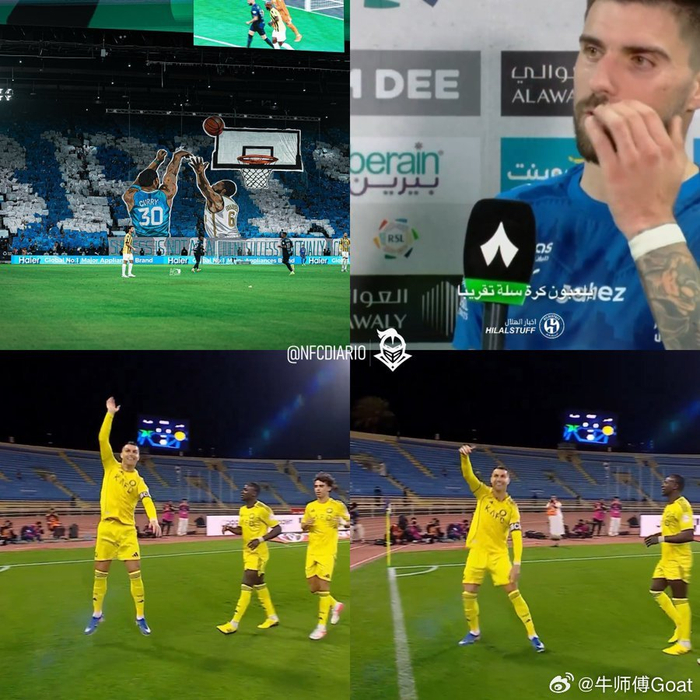 #C罗[超话]# 据葡媒 Ojogo克里斯蒂亚诺·罗纳尔多在对阵纳杰马的比赛中进球后,用投篮庆祝动作嘲讽了利雅得新月。此前,利雅得新月球员鲁本·内维斯发表言论,抨击裁判,他说:"有些人明明在场上打篮球,却没有受到任何处罚。"克里斯蒂亚诺以自己的方式做出了回应,这位葡萄牙球星今天在对阵纳杰马的比赛中进球后,用篮球运动员的手势庆祝。这直接回应了内维斯的言论,同时也讽刺了新月球迷在对阵吉达联合的比赛中展示的巨型横幅,这一幕点燃了看台和社交媒体的热情。#纳杰马体育0比5利雅得胜利##c罗职业生涯965球#