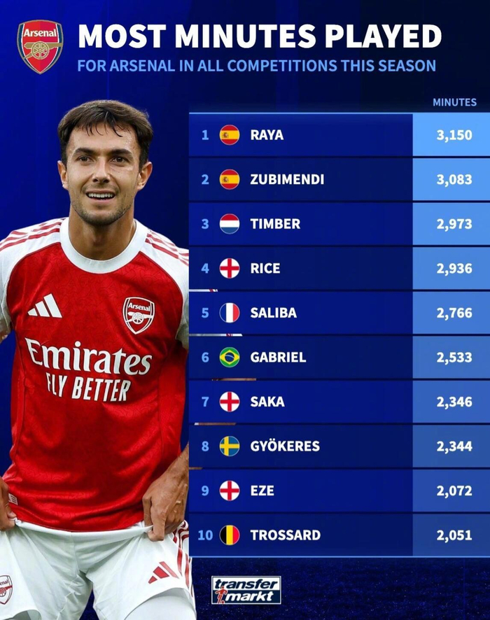 德转统计了本赛季阿森纳球员各项赛事出场时间榜。