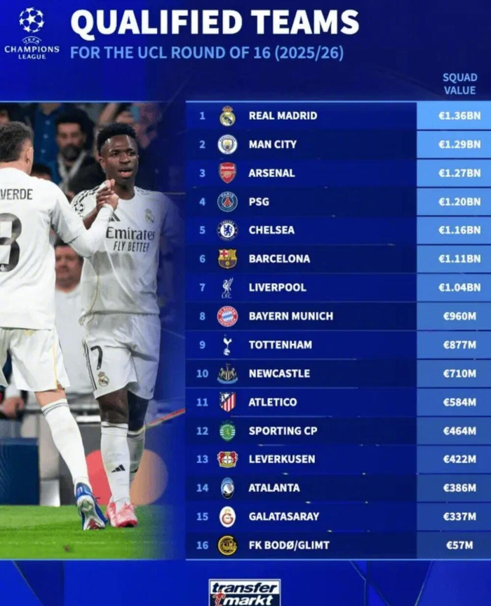 欧冠1/8决赛附加赛次回合全部结束,本赛季的欧冠16强球队全部出炉。德国转会市场统计了这些球队的身价: