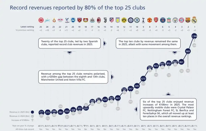 首先,“本财年的收入达到了创纪录的6.91亿镑”肯定是好消息,但这是纵向比较,横向比较的话,阿森纳去年的营收在欧足联刚刚公布的俱乐部收入排名中只排在第7,低于皇马、巴萨、拜仁、曼城、利物浦和巴黎,这显然还是有进步空间的,说明大家都在增长营收,不光是阿森纳自己。我记得前几年温格在的时候,阿森纳的年度营收最高排到过前四,但显然老头子后期那种成绩,长期延续的话营收必然下滑,阿尔特塔兜底反弹很不容易了。