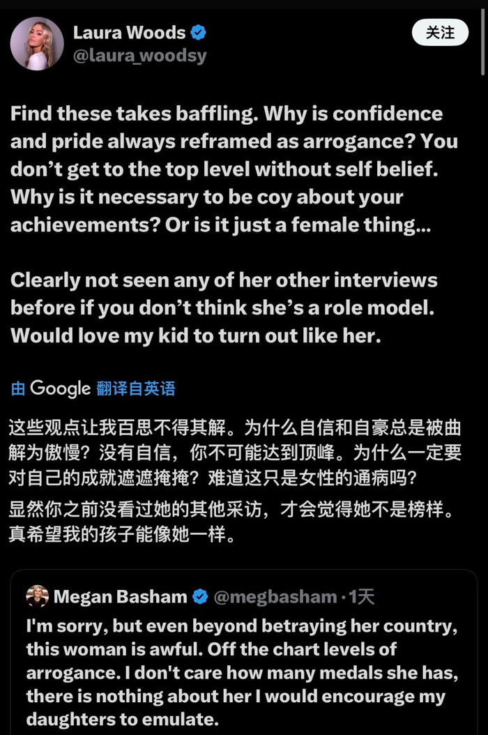 对此,英国女主持Laura Woods回击Megan Basham,她写道:“这些观点让我百思不得其解。为什么自信和自豪总是被曲解为傲慢?没有自信,你不可能达到顶峰。为什么一定要对自己的成就遮遮掩掩?难道这只是女性的通病吗?显然你之前没看过她的其他采访,才会觉得她不是榜样。真希望我的孩子能像她一样。”