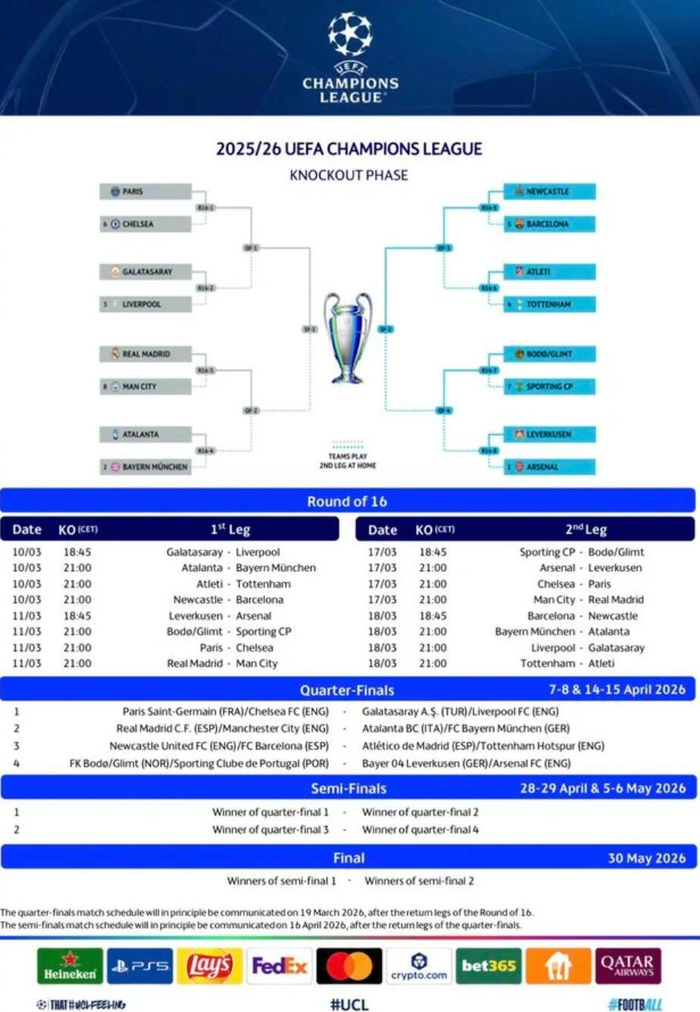 欧冠官方确认1/8决赛比赛时间安排(北京时间):