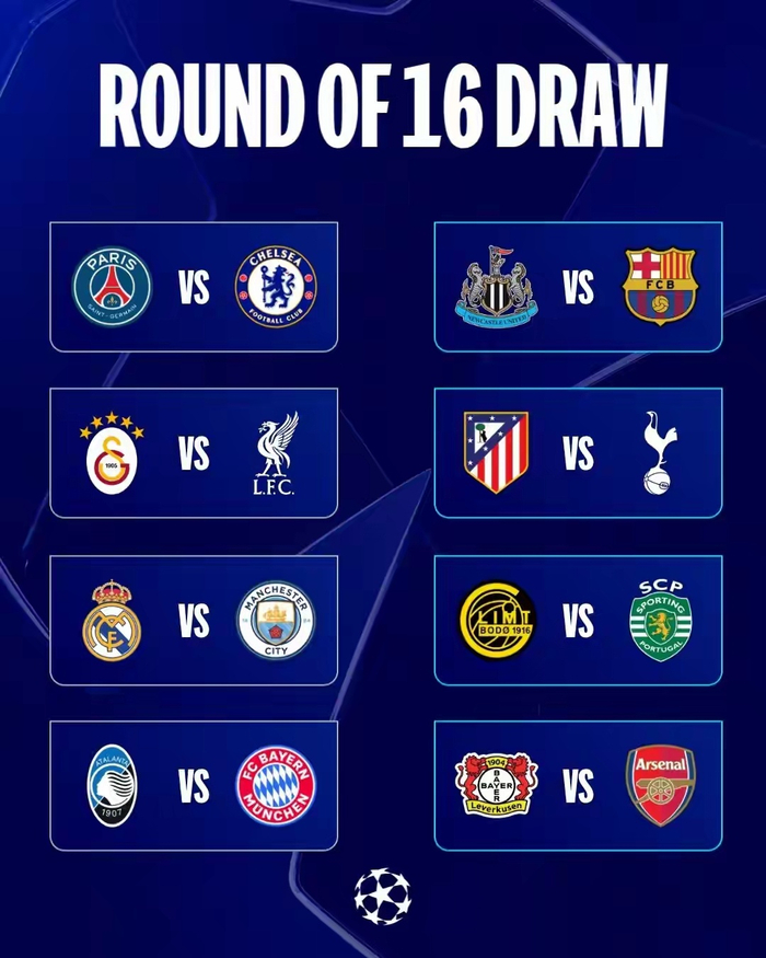 欧冠16强抽签出炉:上半区堪称死亡之组,巴黎、切尔西、利物浦、皇马、曼城、拜仁六支豪门扎堆,每支球队身价均超过9亿欧元,整体强度拉满。