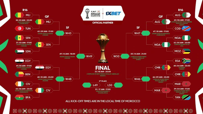 非洲杯1/4决赛将在北京时间1月10日(马里vs塞内加尔、喀麦隆vs摩洛哥)和11日(阿尔及利亚vs尼日利亚、埃及vs科特迪瓦)凌晨进行。