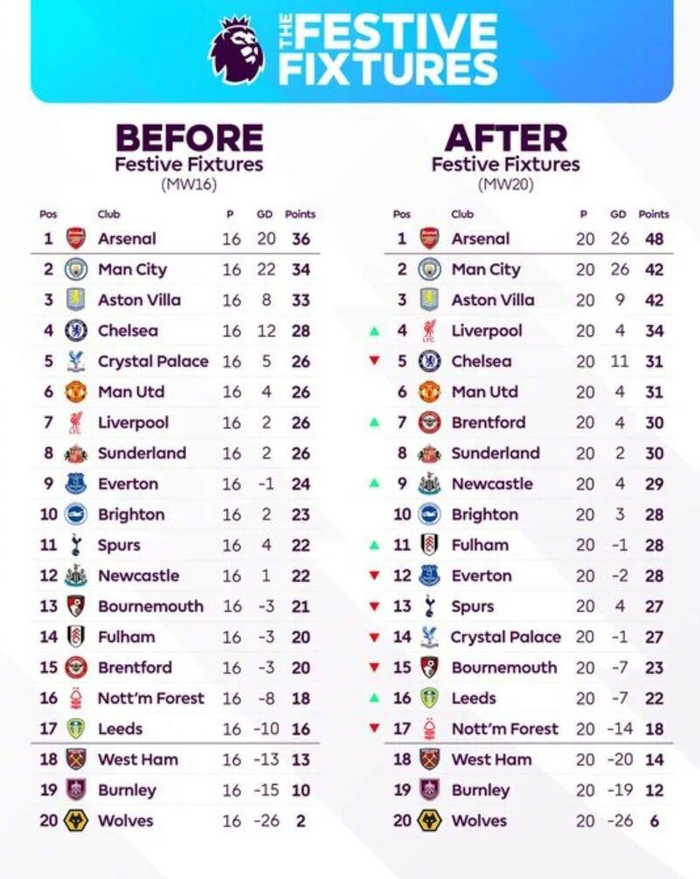 英超官方晒出联赛第16轮至20轮积分榜变化形势。