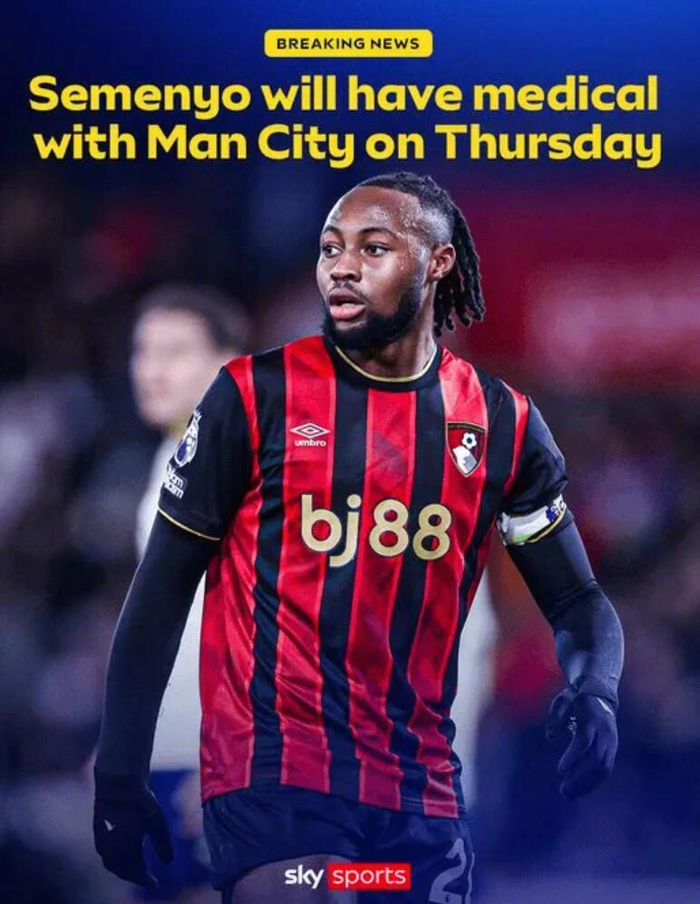 天空体育突发消息,伯恩茅斯前锋安托万-塞梅约将在周四接受曼城的体检。