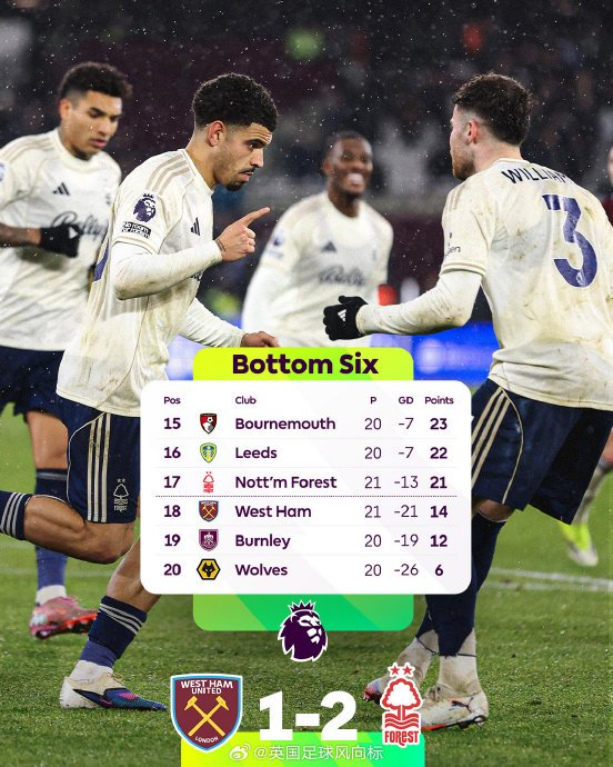【英超保级大局已定?】#西汉姆联1比2诺丁汉森林#,这场保级大战,全不会是本赛季英超保级战的一个关键节点呢?降级区外的森林,作客2比1击败降级内的西汉姆,两队之间的分差拉大到7分。