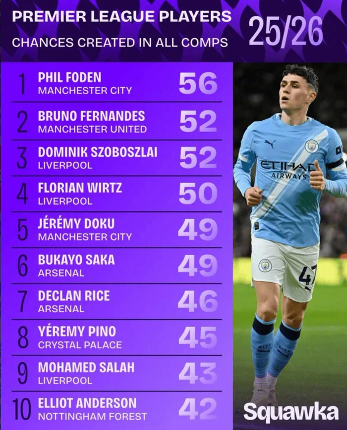 Squawka统计了本赛季在各项赛事创造最多次机会的英超球员,详情如下: