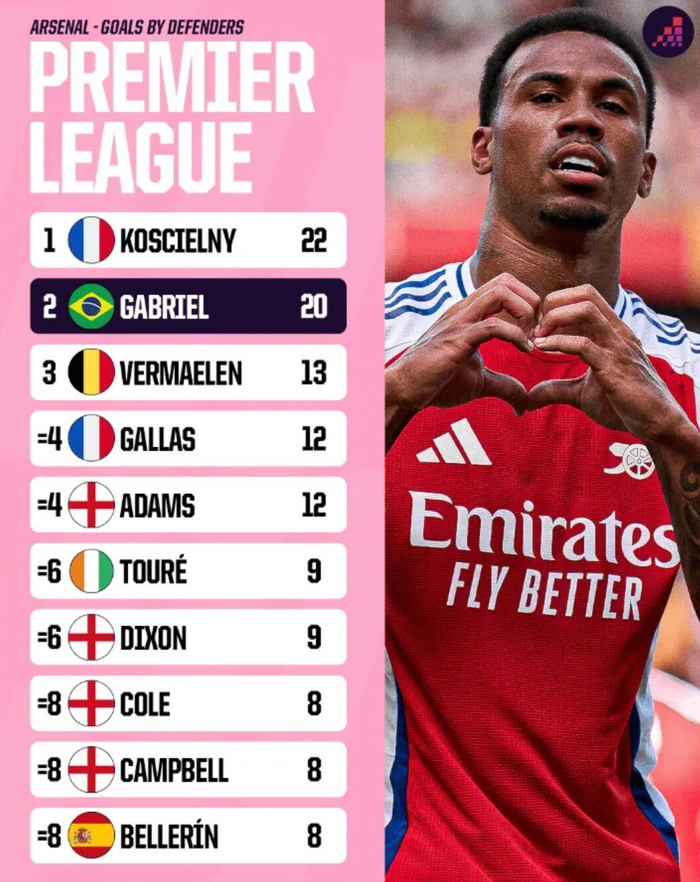 Opta Analyst统计了阿森纳队史在英超联赛里进球最多的后卫: