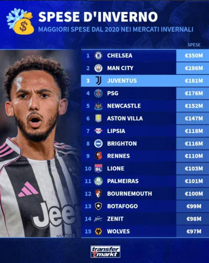 据德转给出的“冬窗支出榜(近5个冬窗)”,切尔西以3.5亿欧元领跑,曼城(2.86亿欧元)与尤文(1.81亿欧元)分列二三位,巴黎(1.76亿欧元)、纽卡(1.52亿欧元)进入前五。